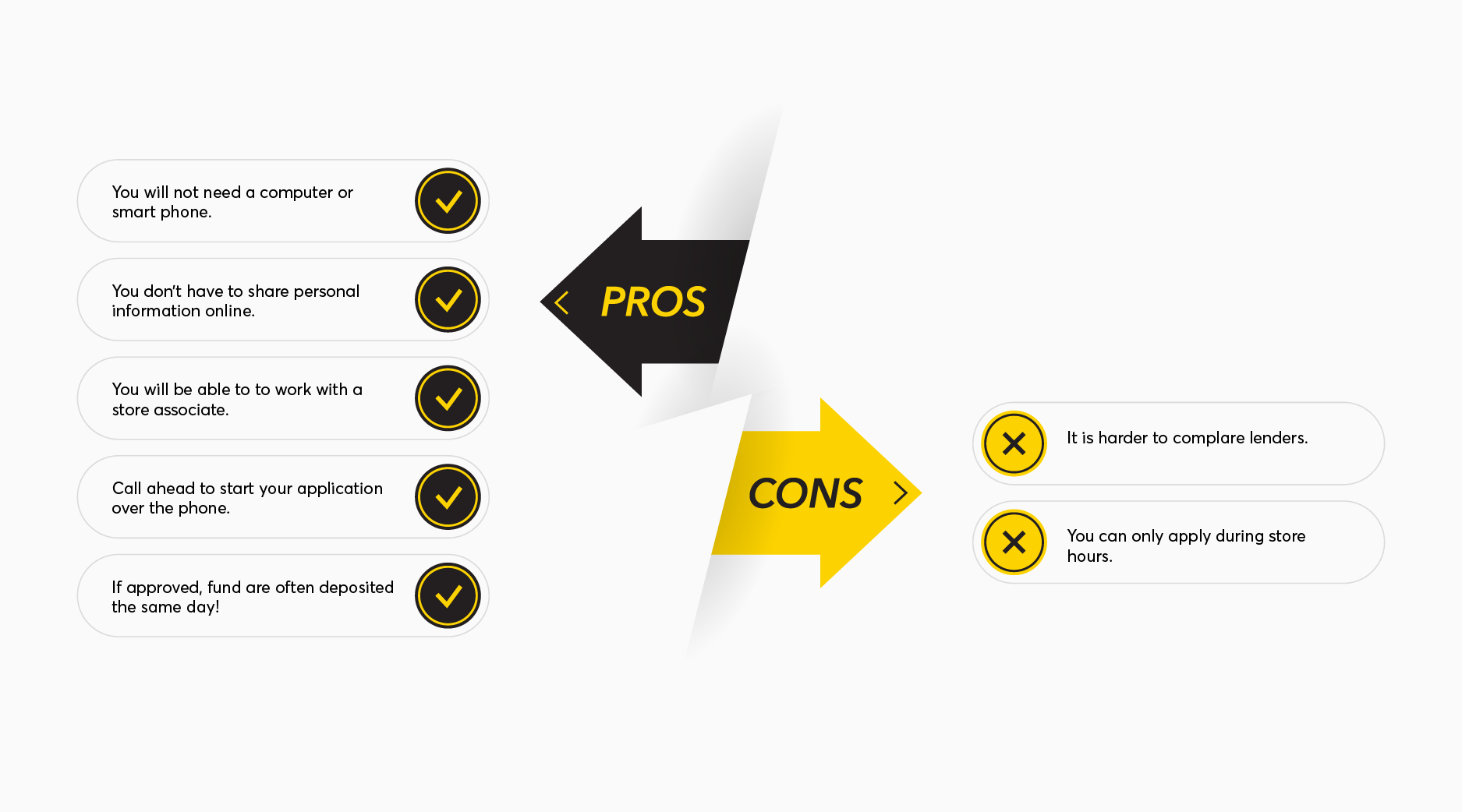 Some people don’t like making purchases or financial transactions on the internet. In which case, it makes more sense to go in-store to apply for a loan. In general, the in-store application process will be very similar to the online process. You will just need to bring the required documents with you instead of submitting them online. The biggest difference is you will have a store associate walking through the steps with you. This allows you to ask questions face to face if you have any. Over time, you may even get to know the associates and look forward to visiting a store again.